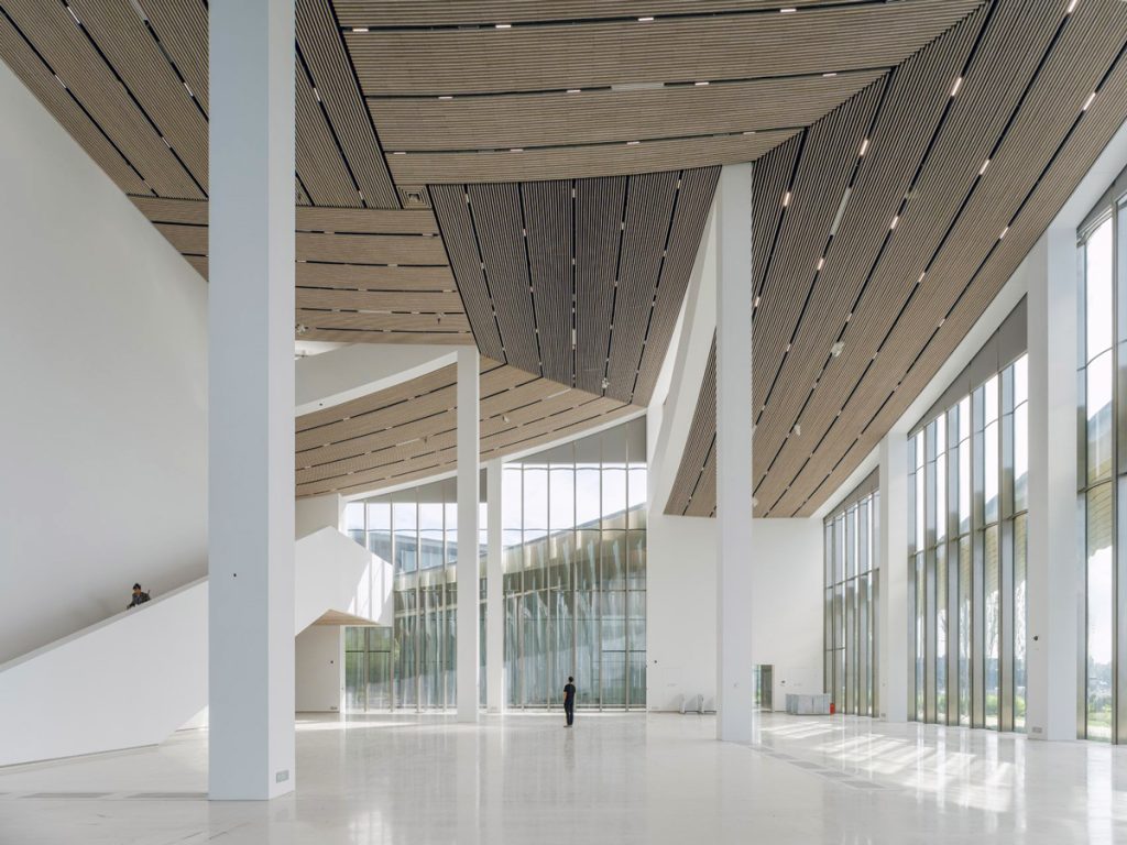 Sustainability is integral to the design. The museum targets China’s GBEL 2-Star Green Building certification and incorporates passive shading, natural ventilation, and regionally sourced materials. The undulating roof is not only sculptural but functional, supporting efficient daylighting and water management systems.