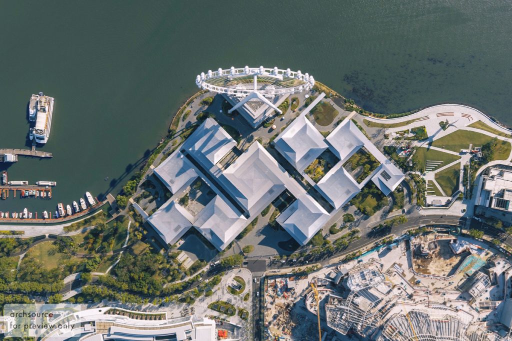 Landscape integration plays a vital role — paved plazas fade into greenery, which transitions to wetland planting along the lake edge, merging ecology with human experience. The architecture thus acts as both gallery and garden, a breathing organism of culture and environment.