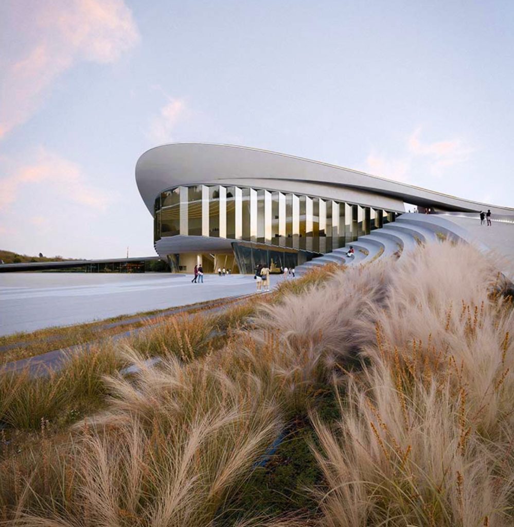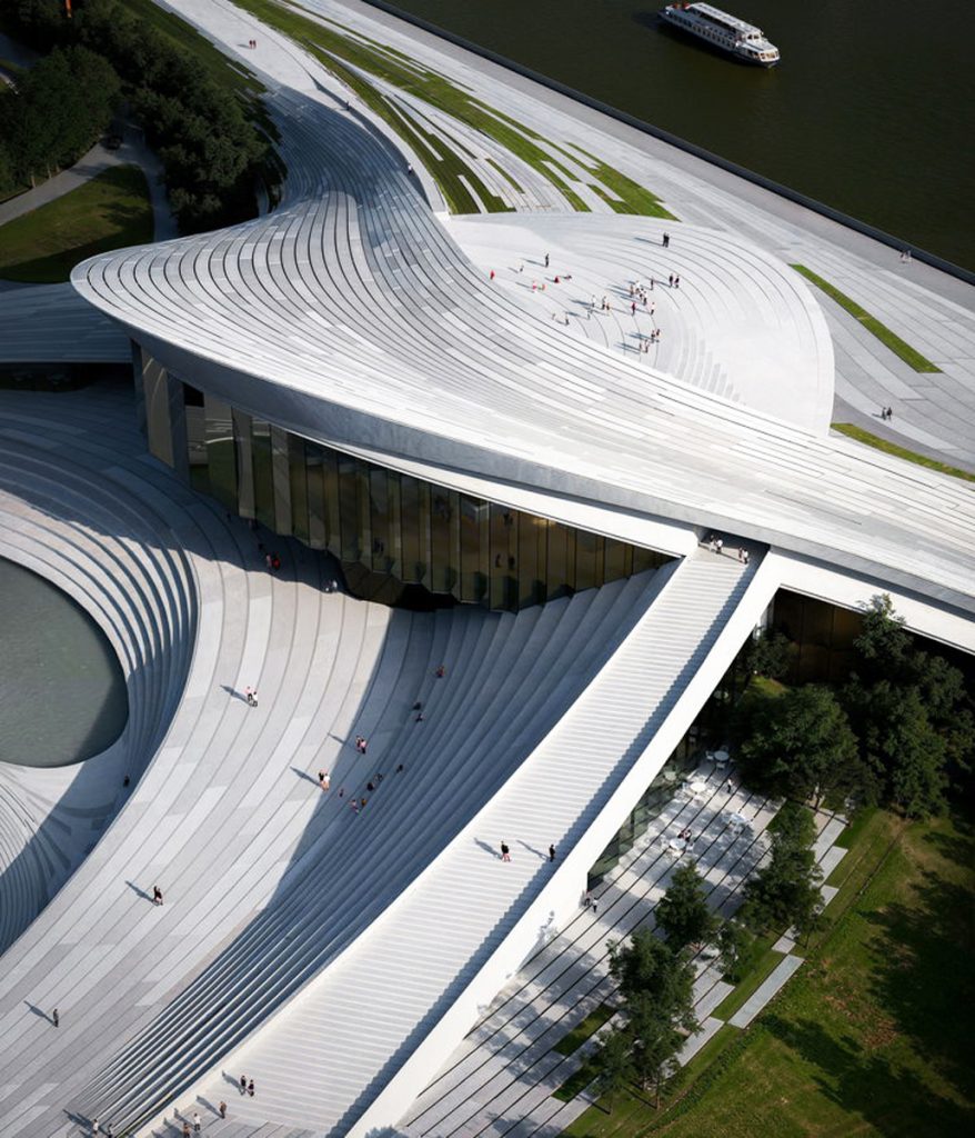 The museum includes an estimated 18,000 m² of total floor area, organized into two sculptural interconnected volumes shaped by the motion of water. A central gateway cuts through the structure, framing direct views and pedestrian movement toward the riverfront.