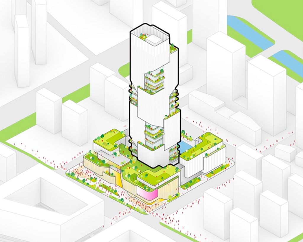 The tower’s massing is defined by interlocking transparent volumes that create stacked voids and carved terraces, allowing light, greenery, and outdoor circulation to weave through the structure. Surrounding the tower, a ring of low-rise volumes creates a human-scaled base, forming landscaped courtyards and a public plaza that softens the transition between corporate headquarters and the surrounding urban fabric.