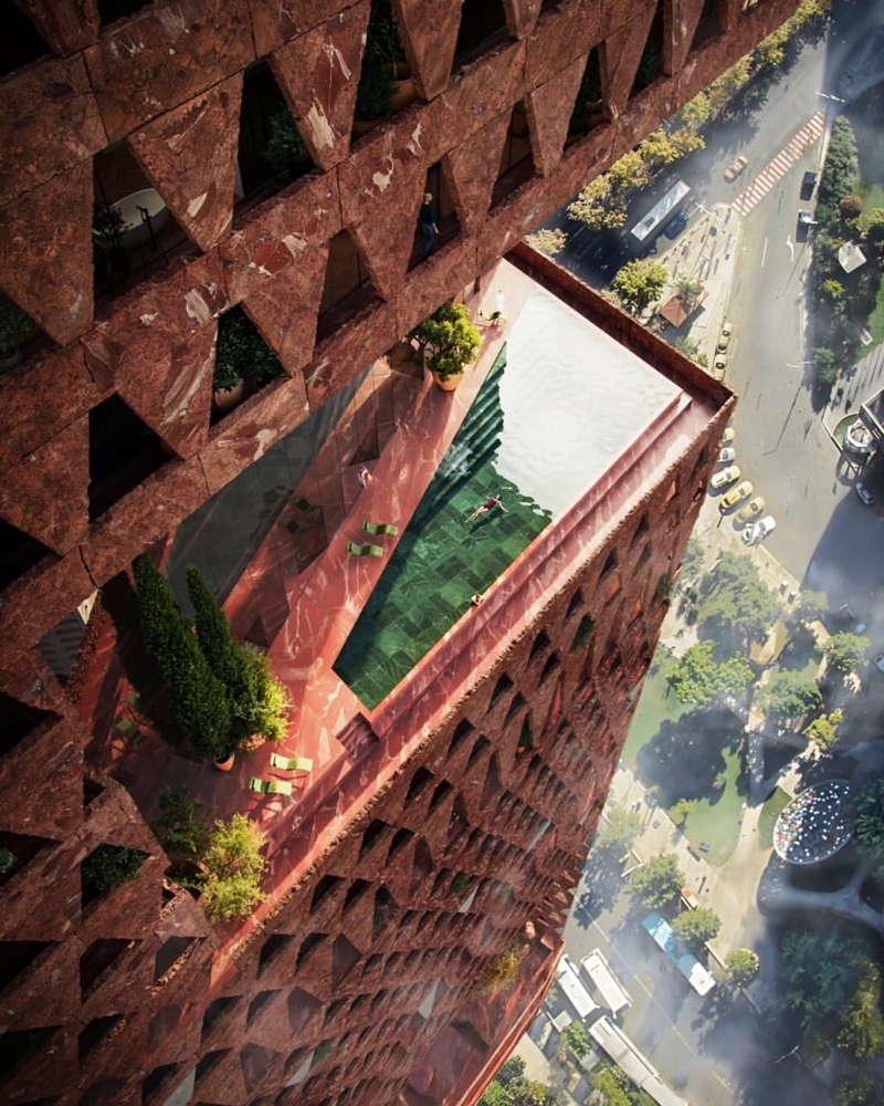 The building organization follows a stacked-program strategy, with lower levels envisioned for public and commercial activity, mid-levels for flexible office and communal amenities, and upper floors for residential living. Core design principles include responsive façade systems, layered balcony treatments, and a structural approach that emphasizes environmental performance and visual texture.