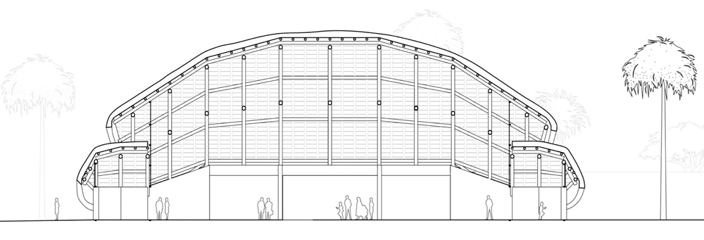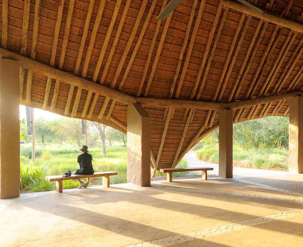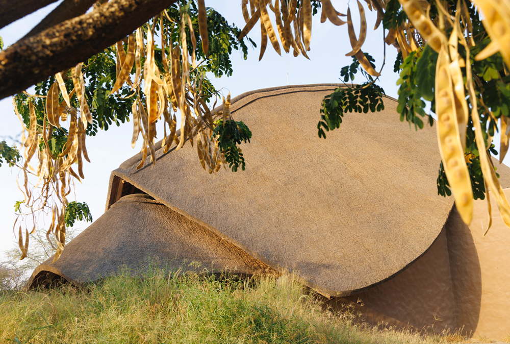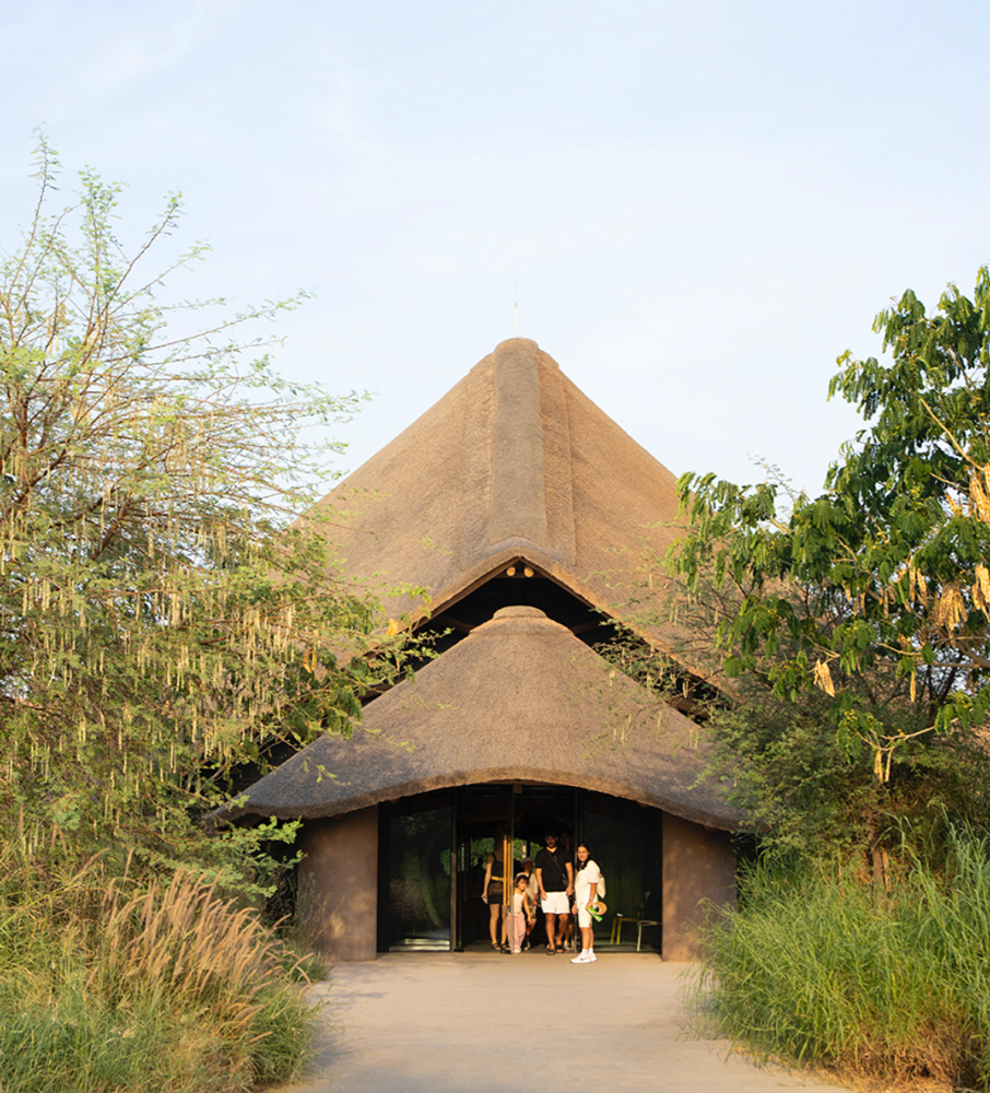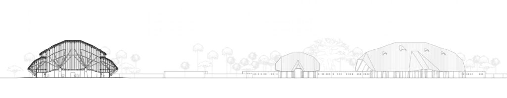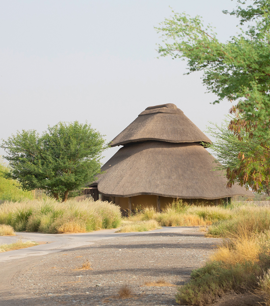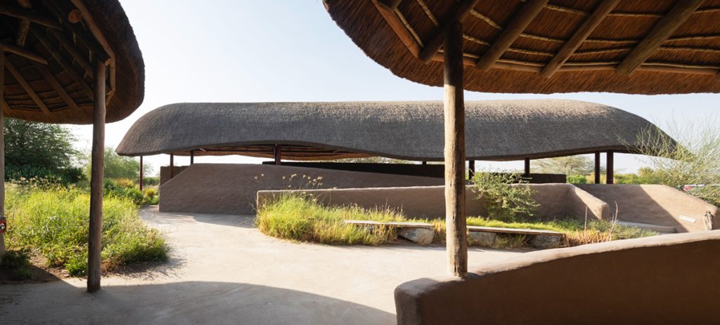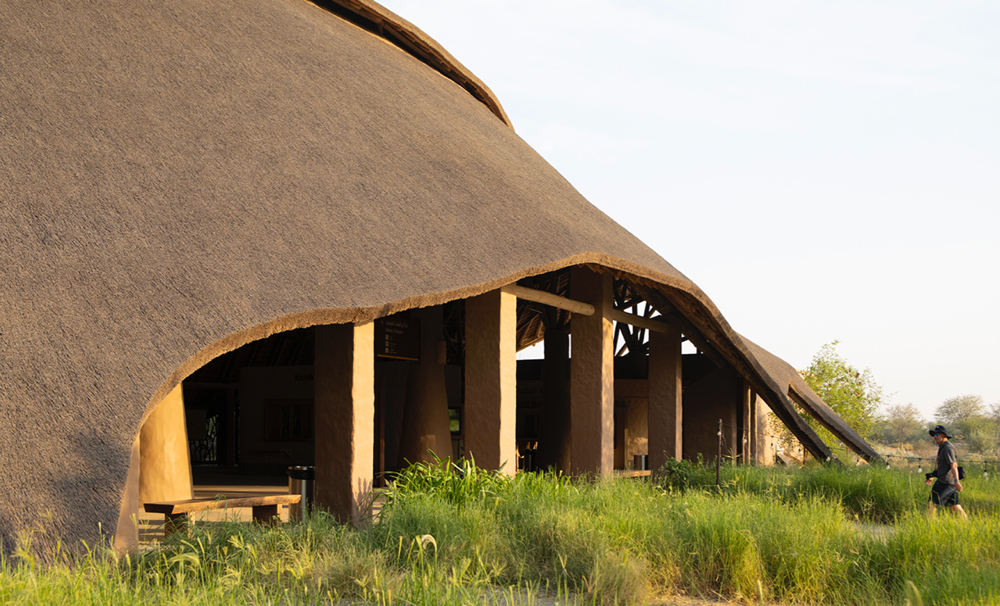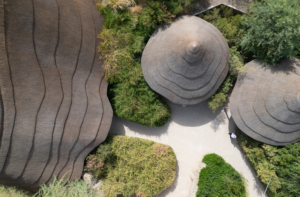 The architecture draws inspiration from traditional African construction techniques, particularly vernacular structures characterized by organic forms, natural materials, and thatched roofing systems.