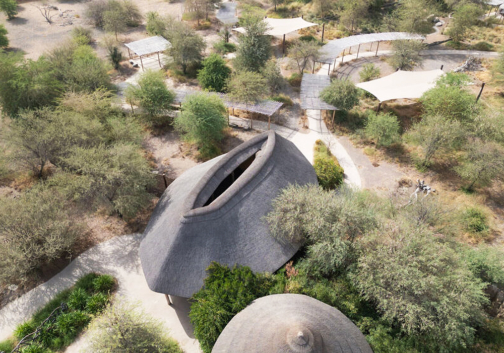Urko Sánchez Architects—known internationally for their work across East Africa—translated these influences into a contemporary architectural language. The resulting structures appear as sculptural forms rising organically from the terrain, resembling natural organisms or “imaginary creatures” emerging from the landscape.