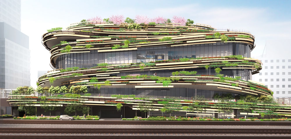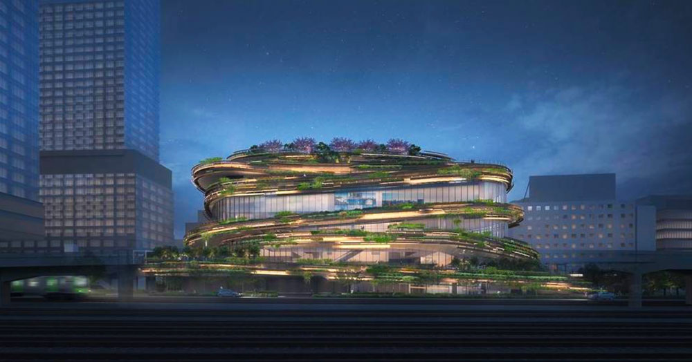 Architecturally, the exterior is led by Kengo Kuma & Associates, with a broader design collaboration involving major Japanese engineering and planning firms. The structure adopts a spiraling form, integrating wood and greenery to create a continuous, walkable architectural experience that connects landscape and built form.